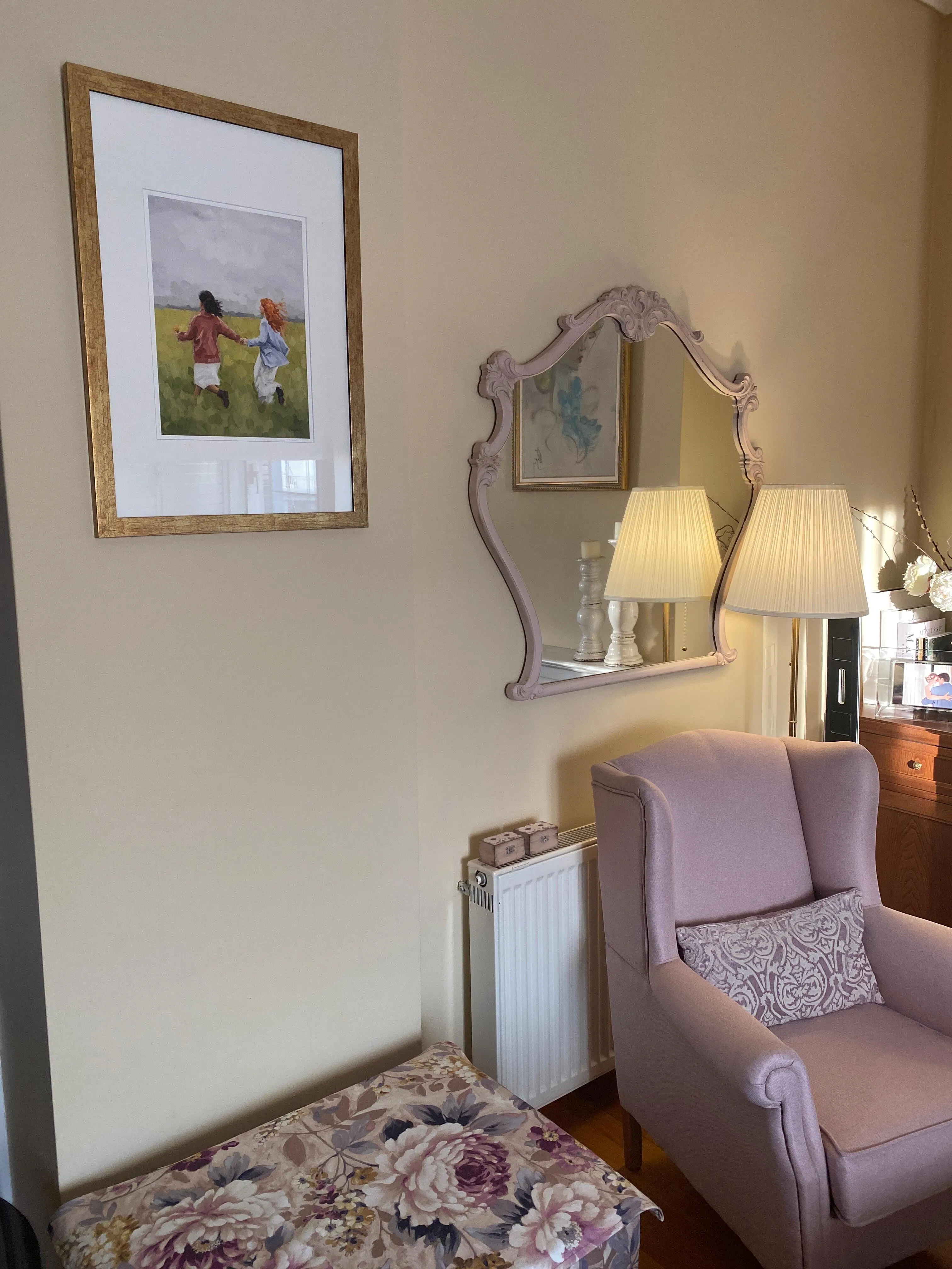 Art print of an original oil painting featuring two women running hand-in-hand through a field, chasing dreams together. Painted using loose brushstrokes, the artwork captures the essence of friendship and freedom.