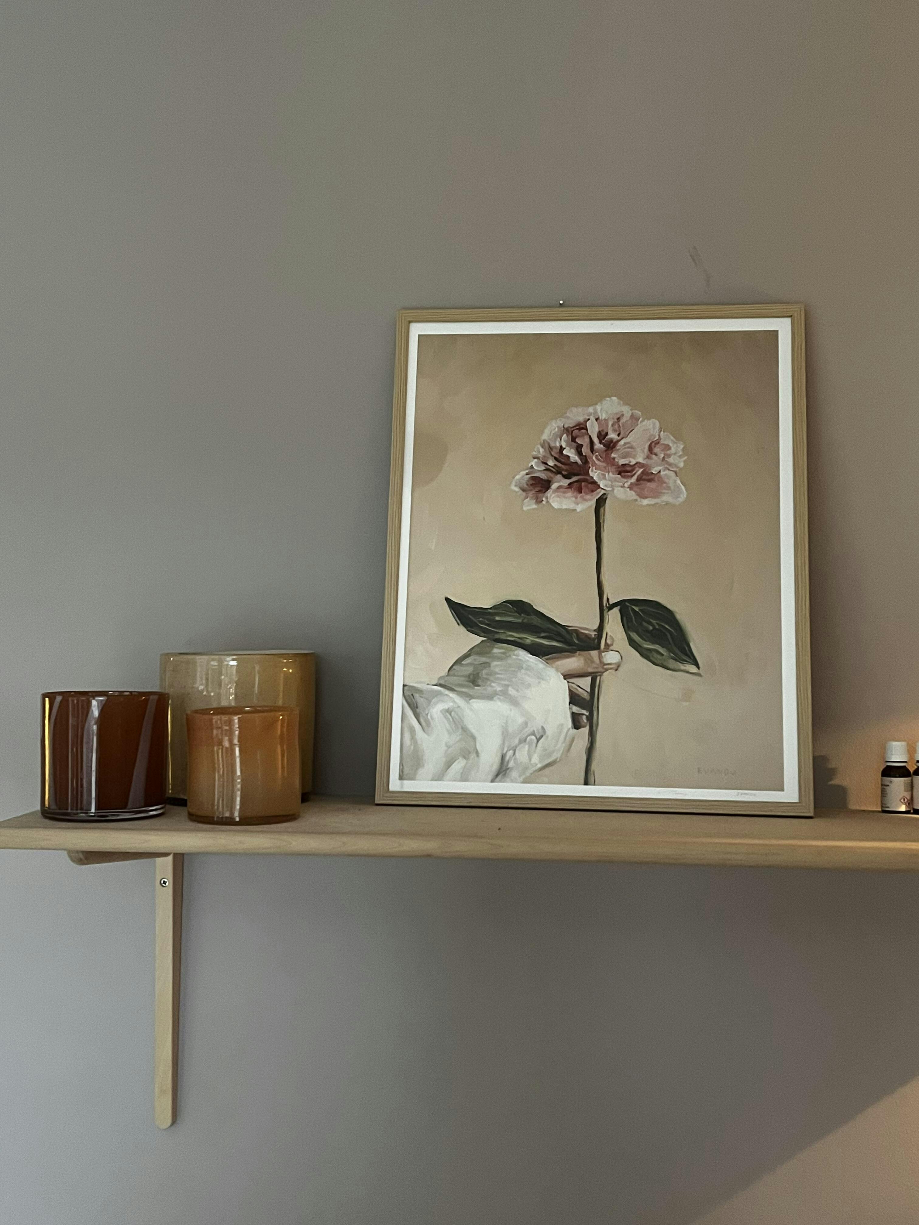Art print picturing a hand holding a peony flower. The peony flower is a symbol of beauty, romance, and prosperity.