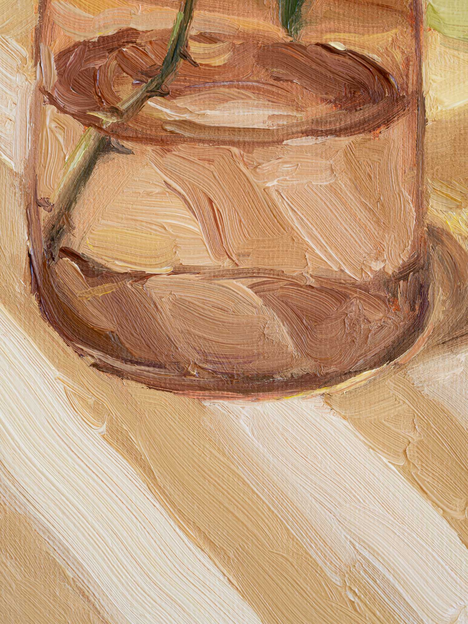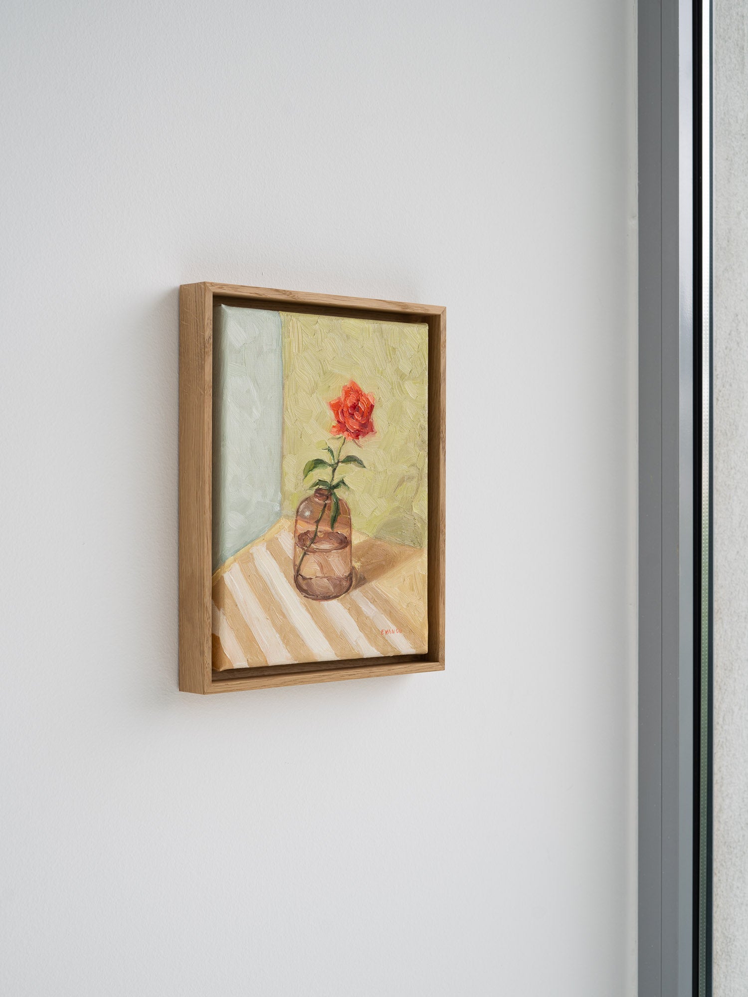 Original oil painting "The Flower I Keep", featuring a single red rose in a glass vase.